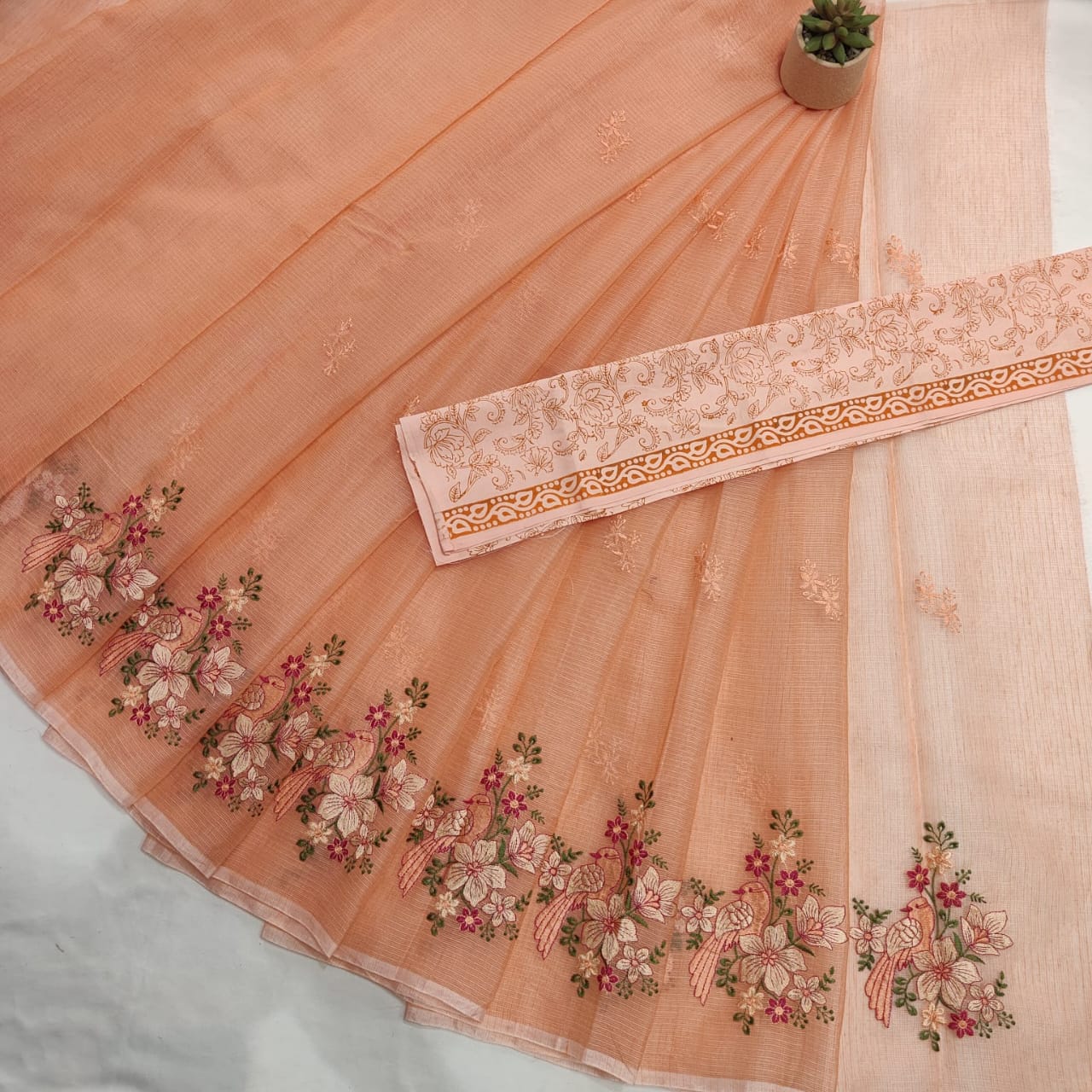 Paired with a contrast embroidery work blouse that complements the saree's design, this ensemble offers a complete, coordinated look. The intricate embroidery on the blouse adds dimension and elegance, making it a versatile choice for weddings, festivals, and formal events.