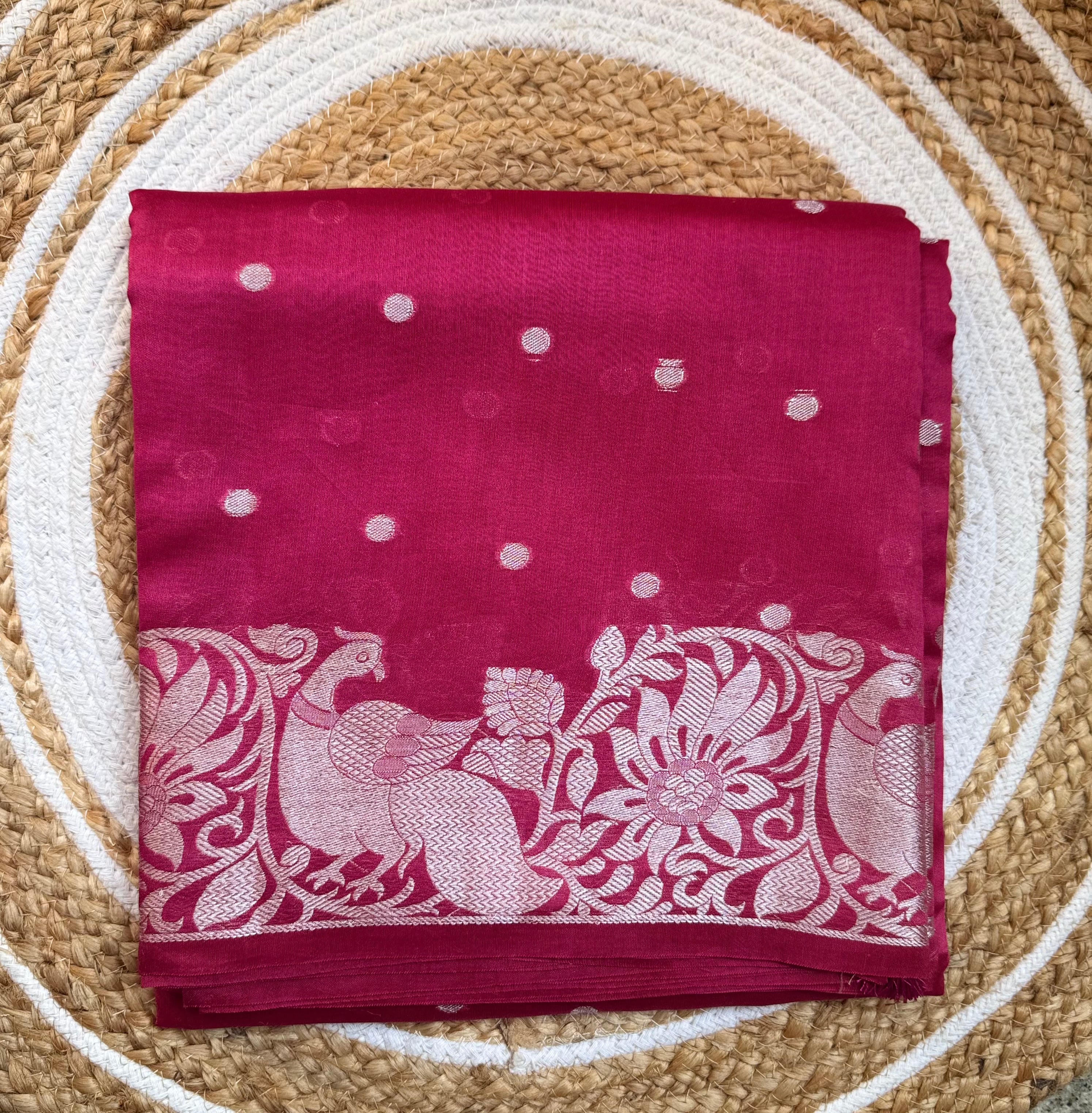 This exclusive Mulbagal Silk saree features a charming Patola Print throughout, complemented by a shiny Foil border on either side. The saree also boasts a luxurious ikkat Pallu and a playful combination of Scalloped Embroidary & Sequence borders. It is adorned with polka butties that add to its unique charm.